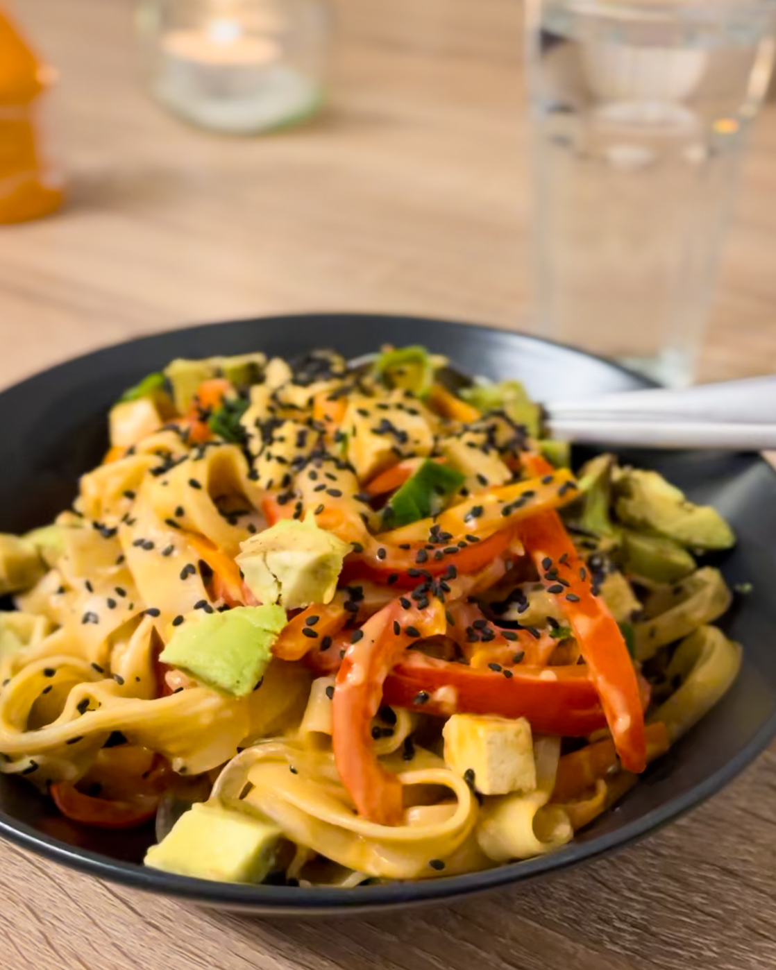 - Soße: Sojasauce, Erdnussbutter, Zitrone, Pfeffer, Agavendicksaft, Sesamöl